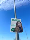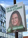 SF’s kandidat i Guldborgsundkredsen, Joan Kragh, har atter været i lygtepælene med sin plakat. Foto: Lars Hovgaard