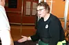Folk i alle aldre var forbi den lille træningsstation, der var blevet sat op i færgens stillezone, i løbet af færgeoverfarten. Foto: Peter Levinsen Hansen