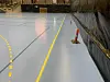 Røde kegler står på Guldboxens halgulv, der to steder hæver sig over jorden. Niveau-stigningen i den store nye hal i Nykøbing kan tydeligt mærkes, når man går på gulvet. En lille forhøjning kan udøverne træde ned i.