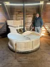 Snedker Anders Jensen med sit svendestykke: Kettinge Mølles nye kværnkasse. Foto: Kettinge Møllelaug