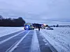 To lastbiler endte på tværs af vejen i glatte forhold, og én person er fløjet til Rigshospitalet efter uheldet.